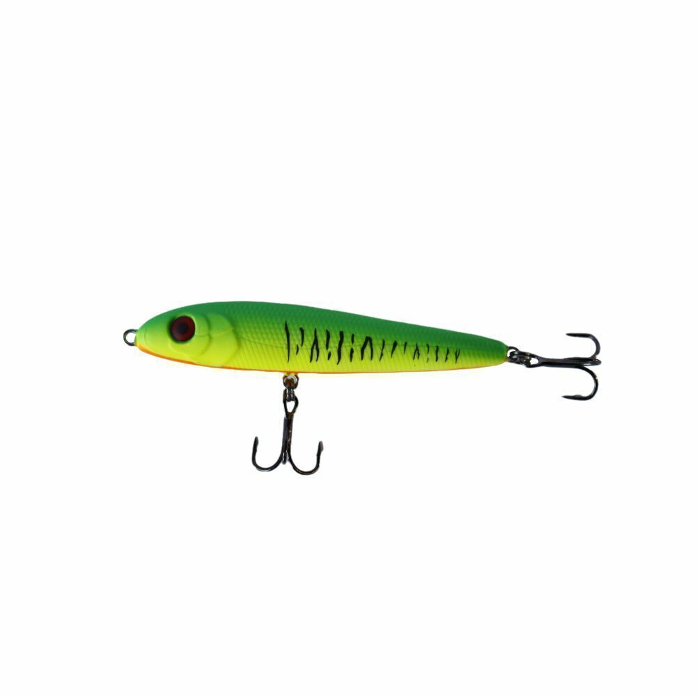 Isca artificial de plástico rígido (hard bait), com ação de superfície (stick/zara), especialmente balanceada para produzir um ruído que chama atenção dos predadores (ratlin), equipada com garateias em aço carbono, extremamente fortes e afiadas.