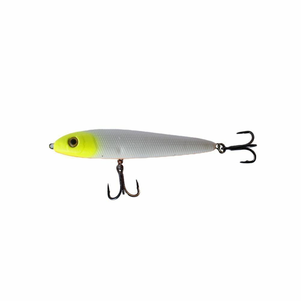 Isca artificial de plástico rígido (hard bait), com ação de superfície (stick/zara), especialmente balanceada para produzir um ruído que chama atenção dos predadores (ratlin), equipada com garateias em aço carbono, extremamente fortes e afiadas.
